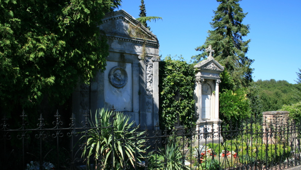 Die monumentalen Grabanlagen der Familie Adt, die sich an der historischen Friedhofsmauer befinden, prägen auch heute noch das Erscheinungsbild des Ensheimer Friedhofs.
